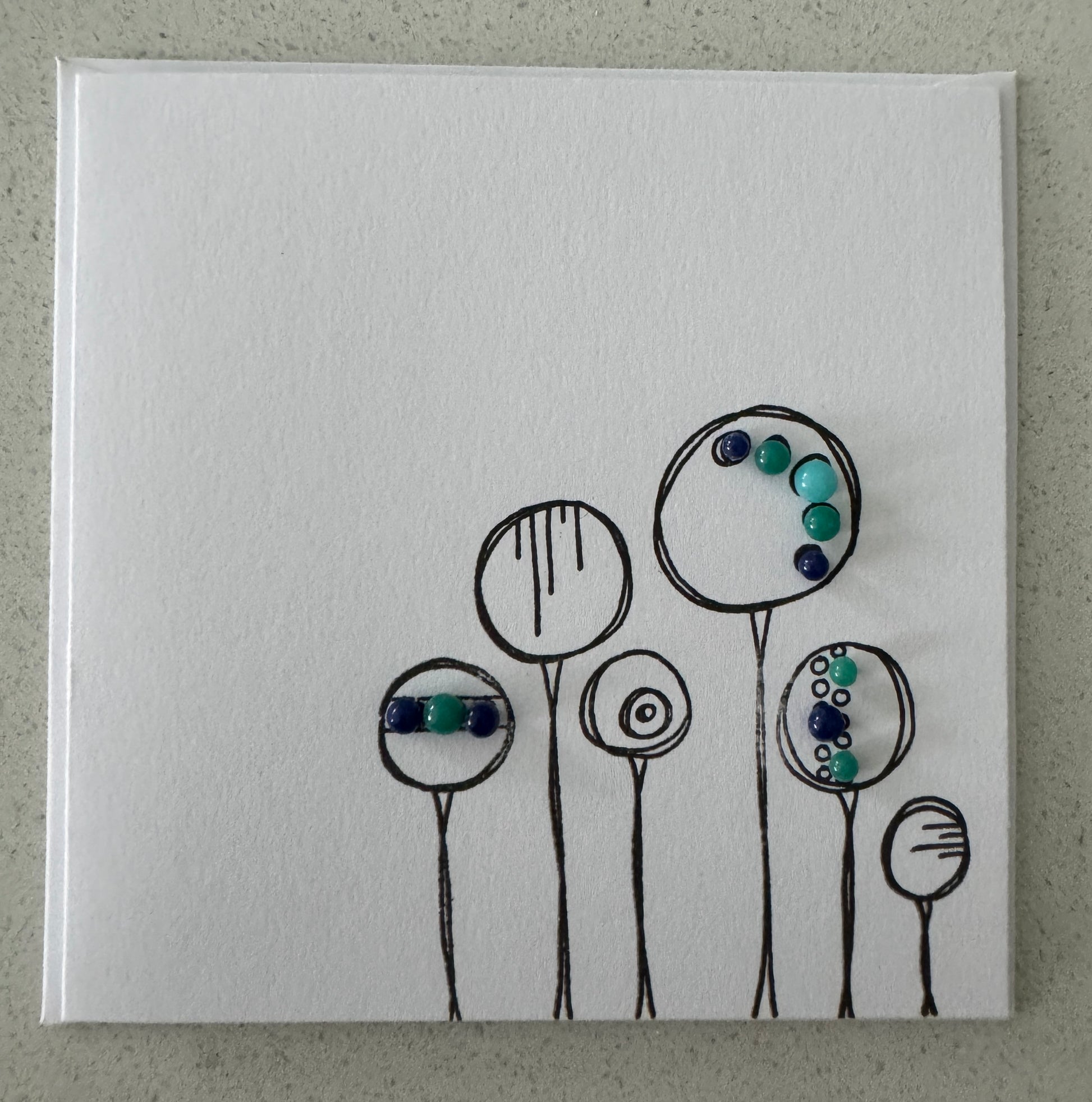 Handmade 10cm x 10cm card, stamped and adorned with various size glass balls.