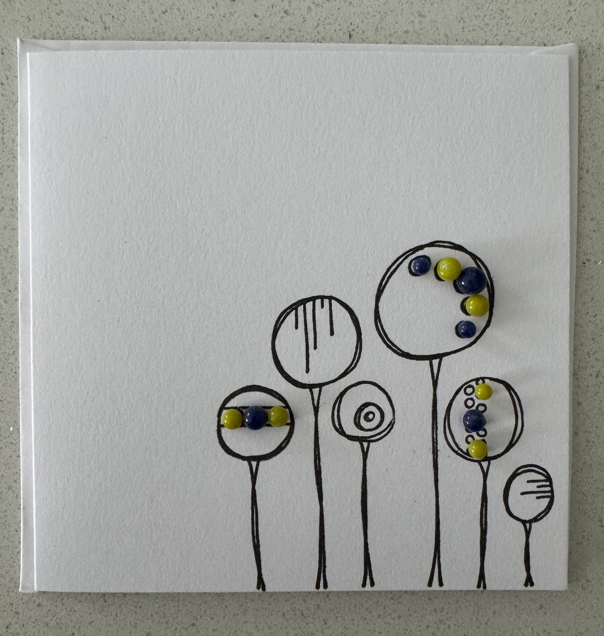 Handmade 10cm x 10cm card, stamped and adorned with various size glass balls.
